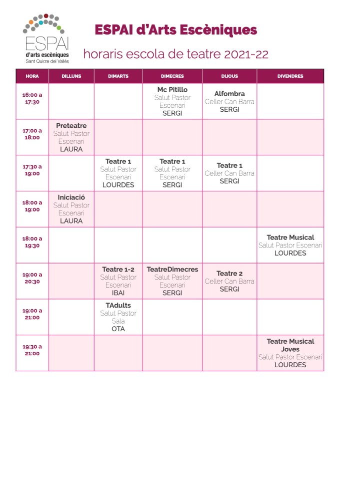 Aquest són els horaris previstos pel curs 2021-22 de l’escola de teatre 19/09/2021 / nani Aquests són els horaris que preveiem per aquest curs 2021-22 Comparteix això: Feu clic per compartir al WhatsApp (S'obre en una nova finestra) WhatsApp Feu clic per compartir al Telegram (S'obre en una nova finestra) Telegram Tweet Feu clic per enviar un enllaç per correu electrònic a un amic (S'obre en una nova finestra) Correu electrònic MésComparteix al Tumblr Feu clic per compartir al Mastodon (S'obre en una nova finestra) Mastodon M'agrada S'està carregant... Relacionats