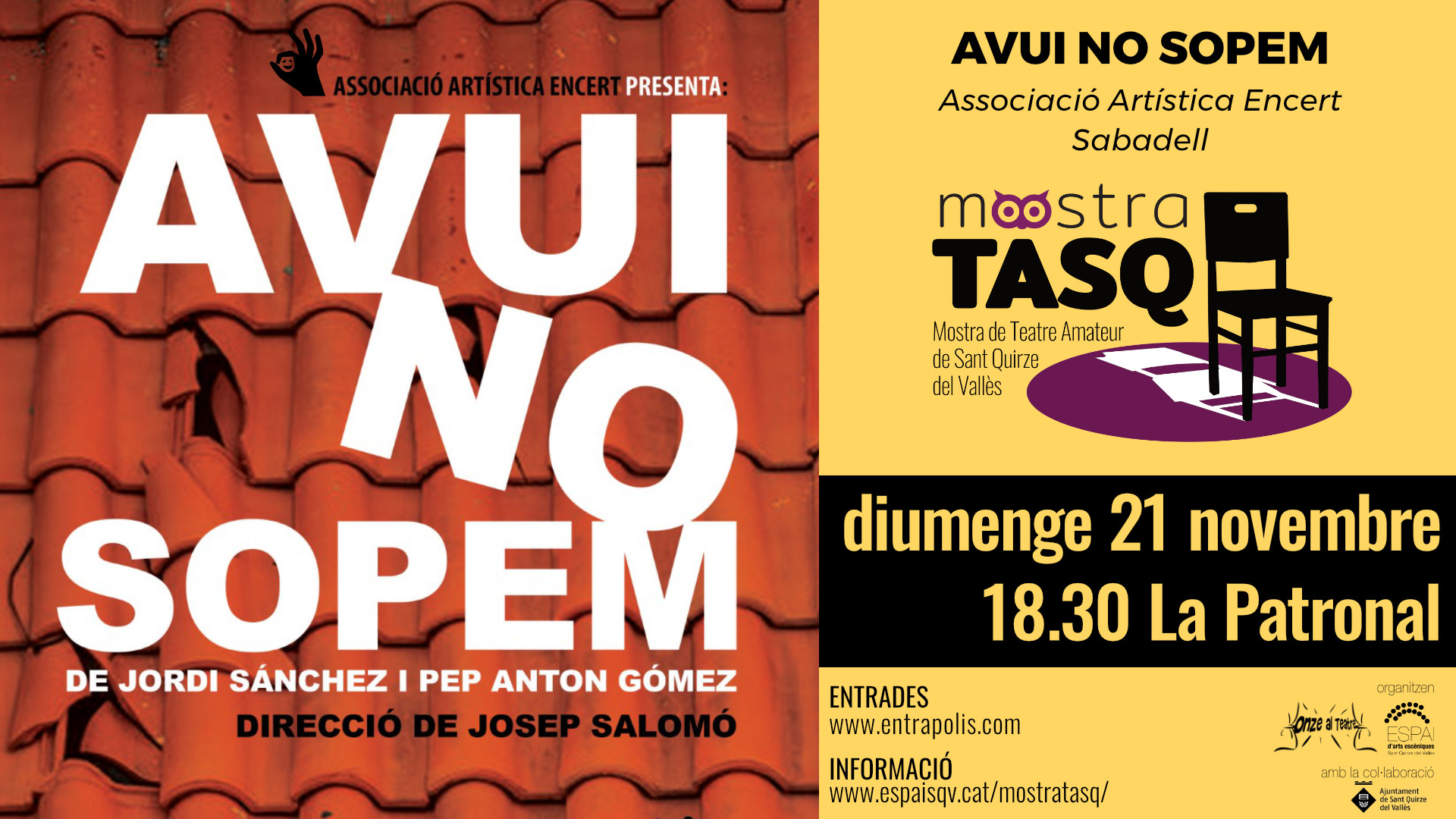 La segona obra de la Mostra TASQ és una comèdia amb la família com a tema. Avui no sopem mostra com les relacions entre pares i fills es van transformant al cap dels anys i els interessos d’uns topen amb els dels altres. Quan tothom va a la seva però es conviu sota el mateix sostre, les tensions i les situacions còmiques no hi faltaran. Els fills s’han fet grans però no han marxat de casa i els pares no troben la manera de fer els seus propis plans.