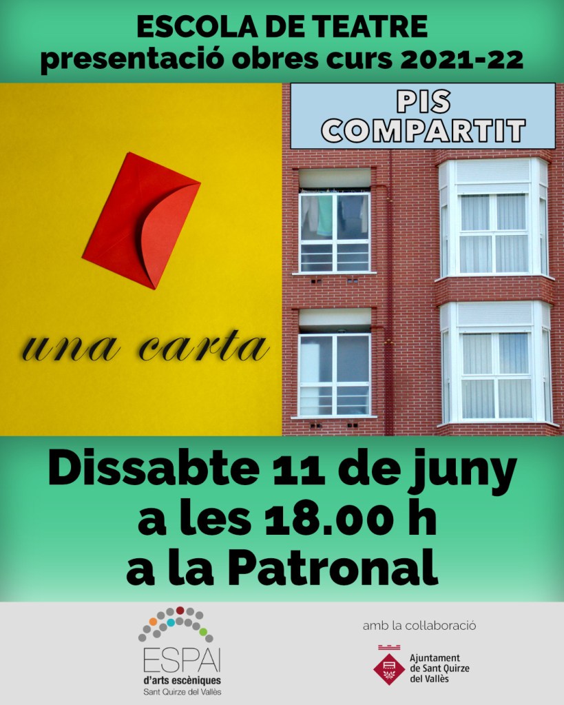 El dissabte 11 de juny, tindrem l’oportunitat de veure l’estrena d’Una carta i la possibilitat de tornar a veure Pis compartit. La sessió començarà a les 18.00 a la Patronal.