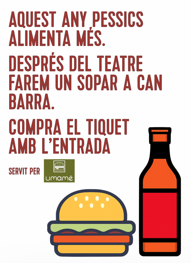 Després del teatre farem un sopar a Can Barra. Serà un sopar senzill, amb hamburguesa i beguda, per poder acabar de comentar la jornada a les taules i cadires que tindrem a punt. Aquest sopar el fem amb el restaurant Umame Burger del carrer Montserrat 20. Hi haurà opció d’hamburguesa vegana i de pa sense gluten. El preu d’aquest menú serà de 13€ i podreu fer la compra del tiquet conjuntament amb les entrades perquè no us en quedeu sense.