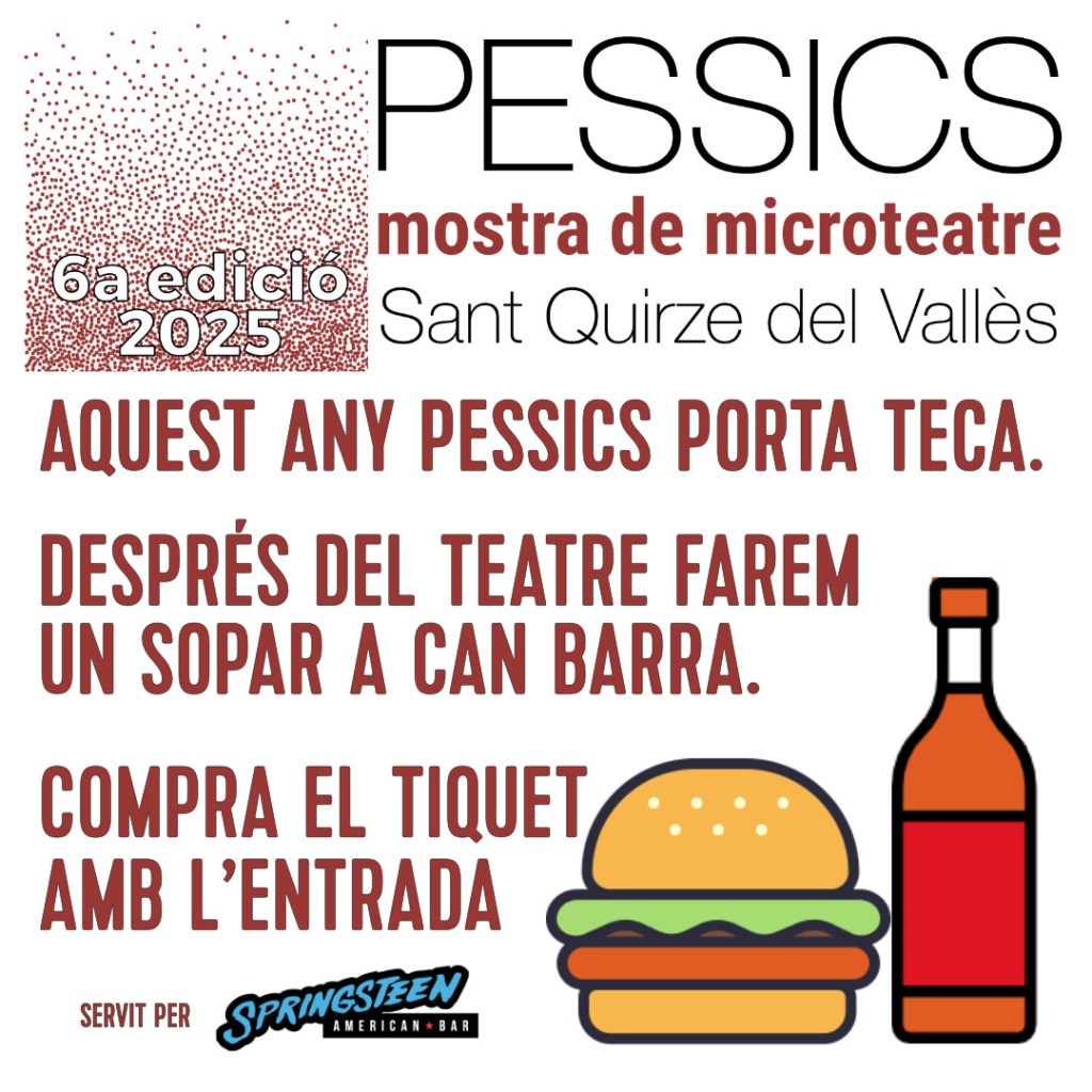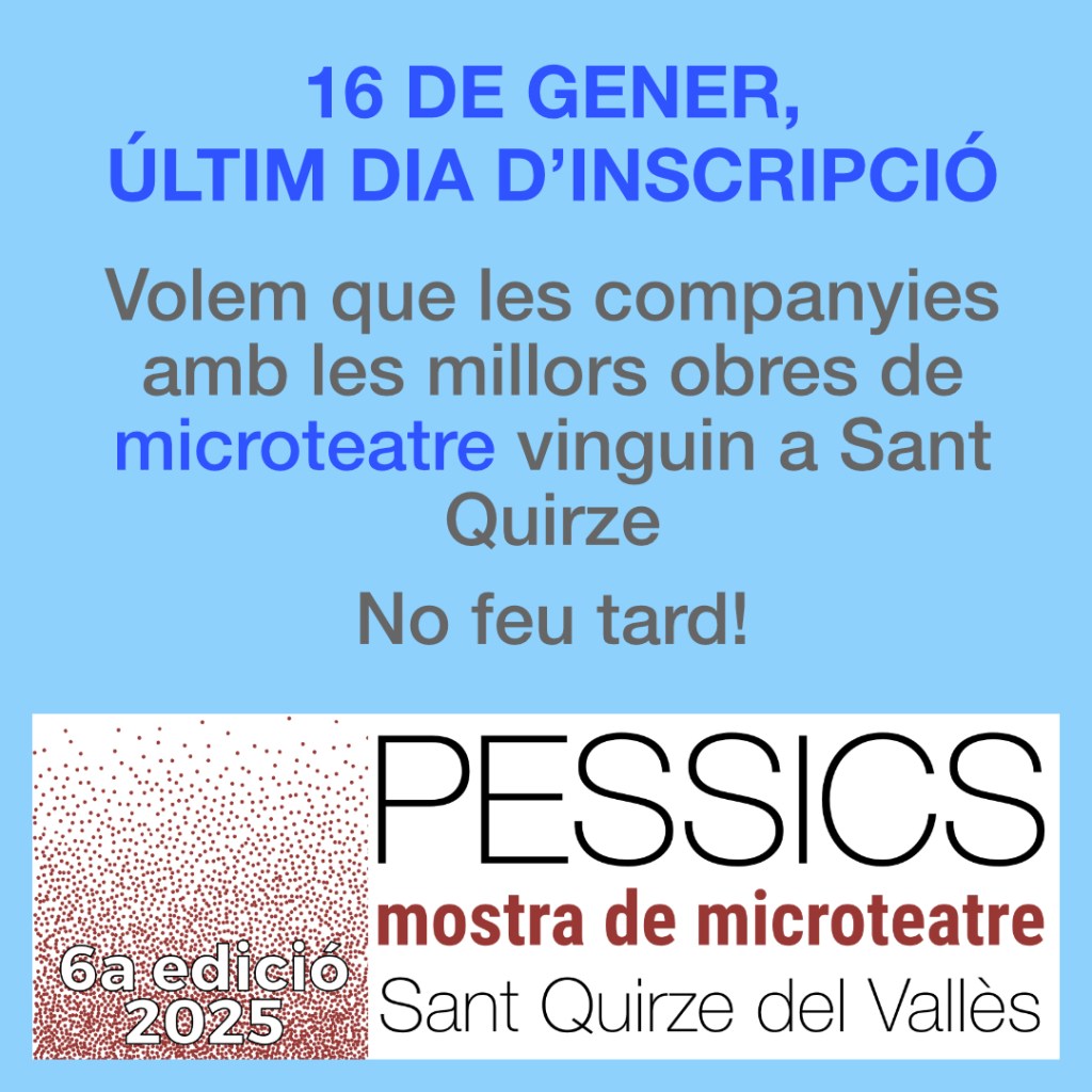 El 25 de gener de 2026 tancarem el termini d’inscripció a PESSICS 2026, la mostra de microteatre de Sant Quirze. Totes les companyies amb obres de microteatre esteu convidades a participar en aquesta 7a edició.